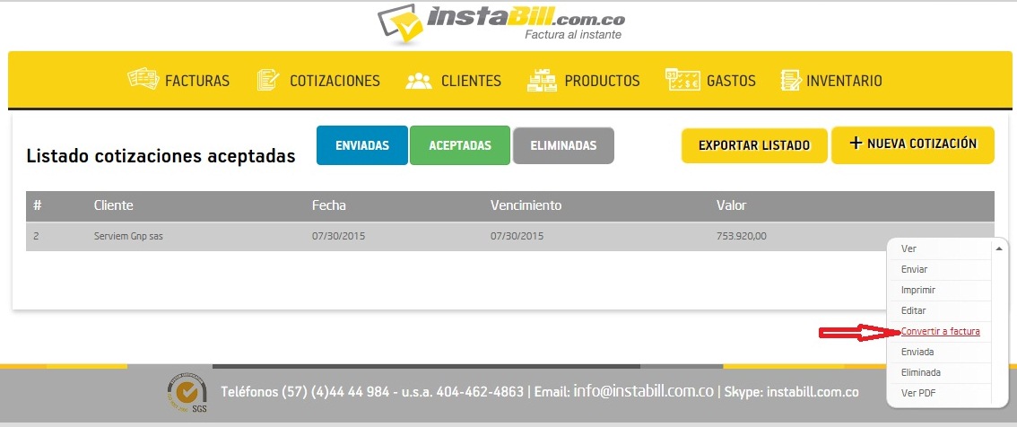 - Ingresa al menú derecho del módulo de Cotizaciones aceptadas y pulsa en CONVERTIR A FACTURA y finalmente enviarla al cliente.