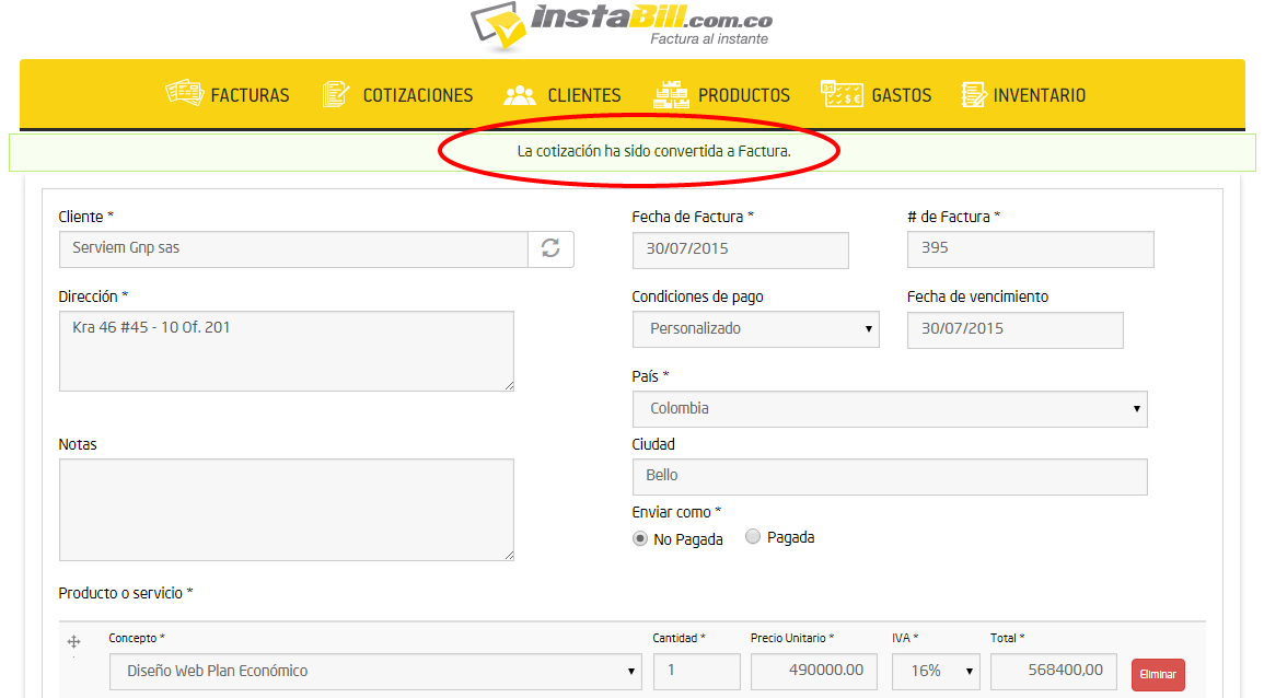 La filosofía de InstaBill.com.co es simplificar los procesos, por eso agregamos la función de convertir una cotización aceptada en factura con UN SOLO CLICK y así enviársela a su cliente en segundos.